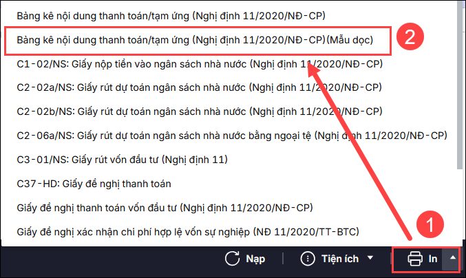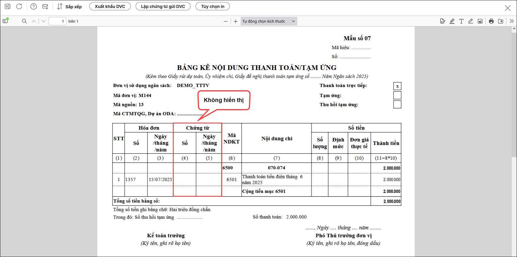 • Trên Bảng kê nội dung thanh toán/tạm ứng sẽ không hiển thị Số chứng từ và Ngày chứng từ.