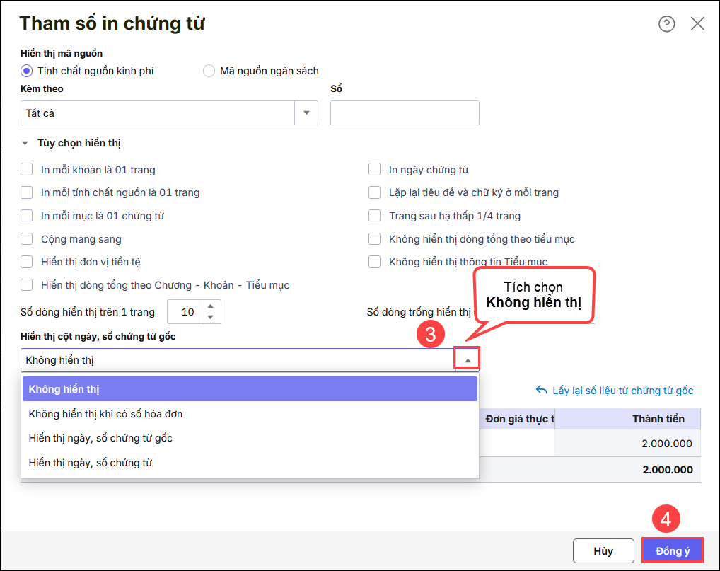 Bước 2: Tại Bảng tham số in chứng từ: Phần Hiển thị ngày, số chứng từ gốc chọn Không hiển thị.