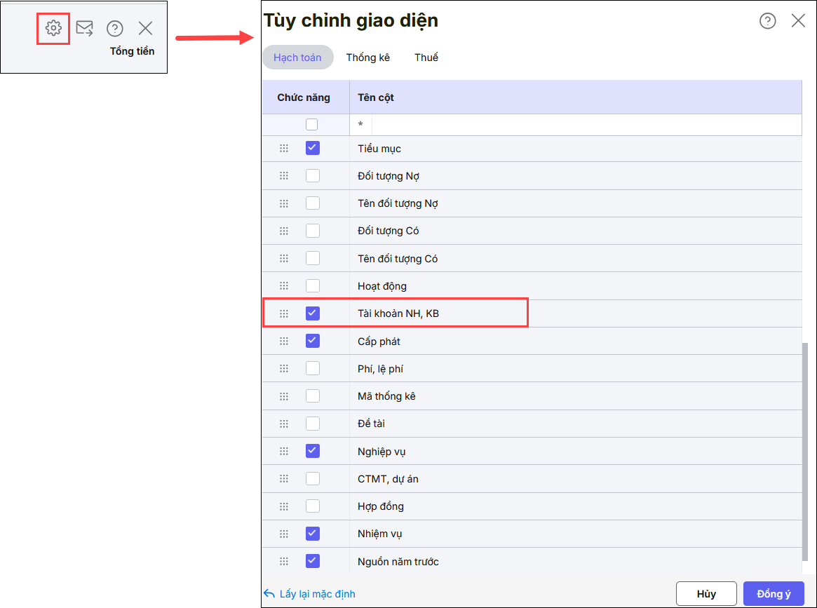 Lưu ý: Nếu không thấy cột Tài khoản NH, KB để chọn, bạn nhấn Chuột phải/tích chọn “Tài khoản NH, KB”/Đồng ý