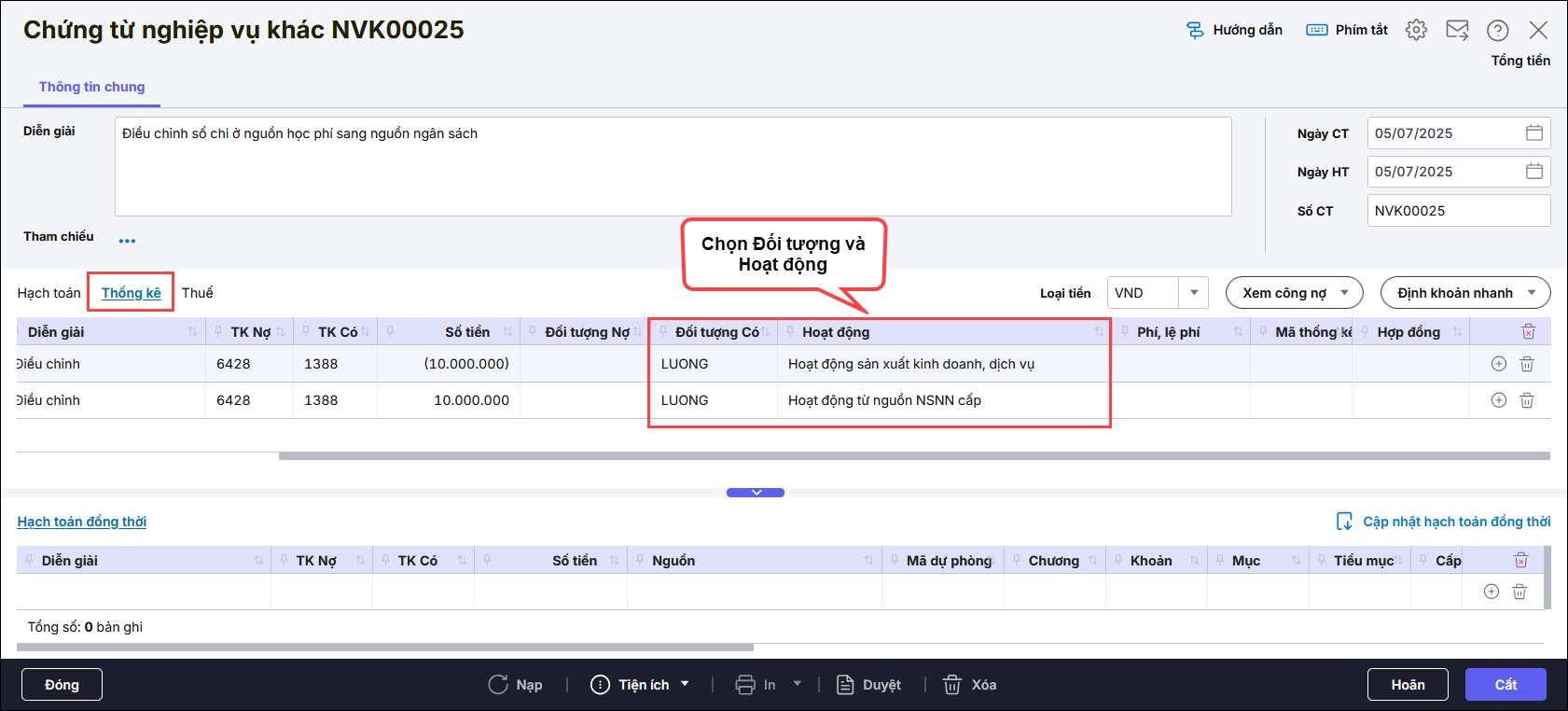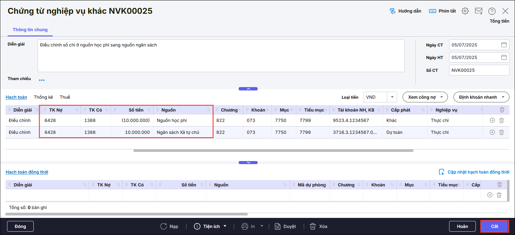 • Nợ TK 642/Có TK 1388 : Số tiền âm (10.000.000), chọn Nguồn Học phí.