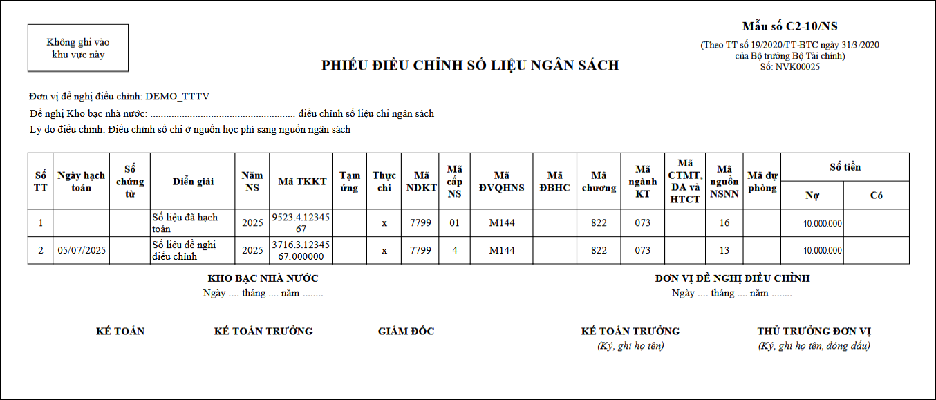 Phần mềm sẽ hiển thị Phiếu điều chỉnh số liệu ngân sách C2-10/NS như sau: