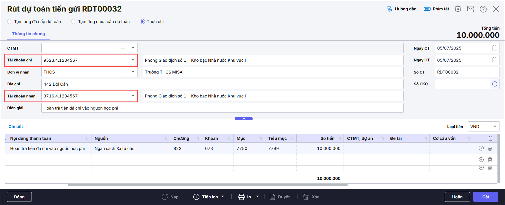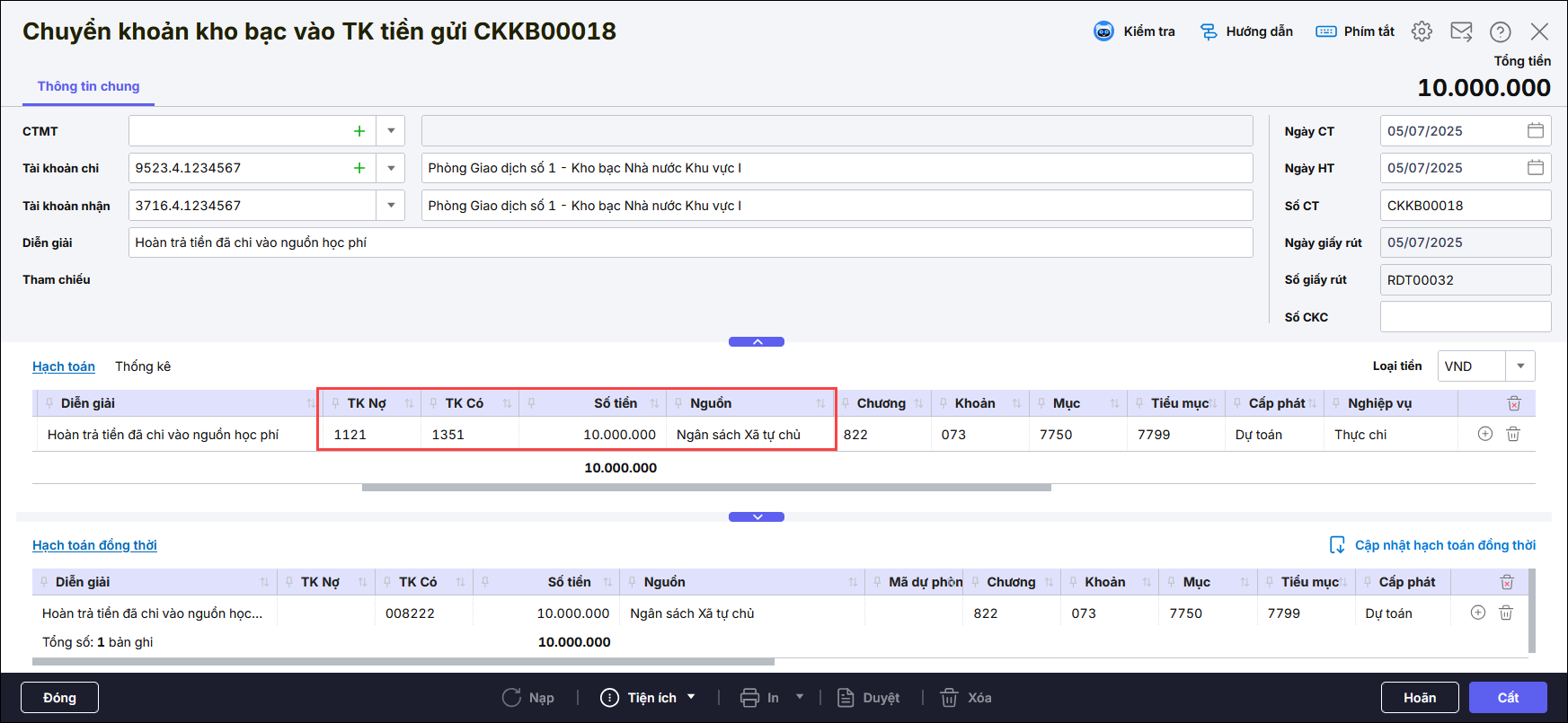 Ví dụ: Đơn vị đã chi 10.000.000 ở nguồn học phí, sau đó được cấp tiền về tài khoản tiền gửi 3716 tại Kho bạc của nguồn ngân sách tự chủ để hoàn trả cho nguồn học phí.
