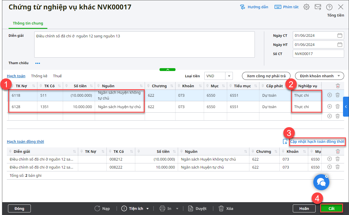 Bước 3: Sau đó nhấn Cập nhật hạch toán đồng thời và nhấn Cất.