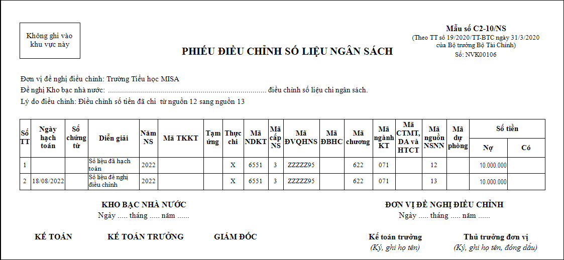Ví dụ: Đơn vị cơ quan nhà nước, đơn vị khác không có hoạt động sản xuất kinh doanh cần điều chỉnh 10 triệu đã chi ở nguồn không tự chủ (nguồn 12) sang nguồn tự chủ (nguồn 13) tiểu mục 6551