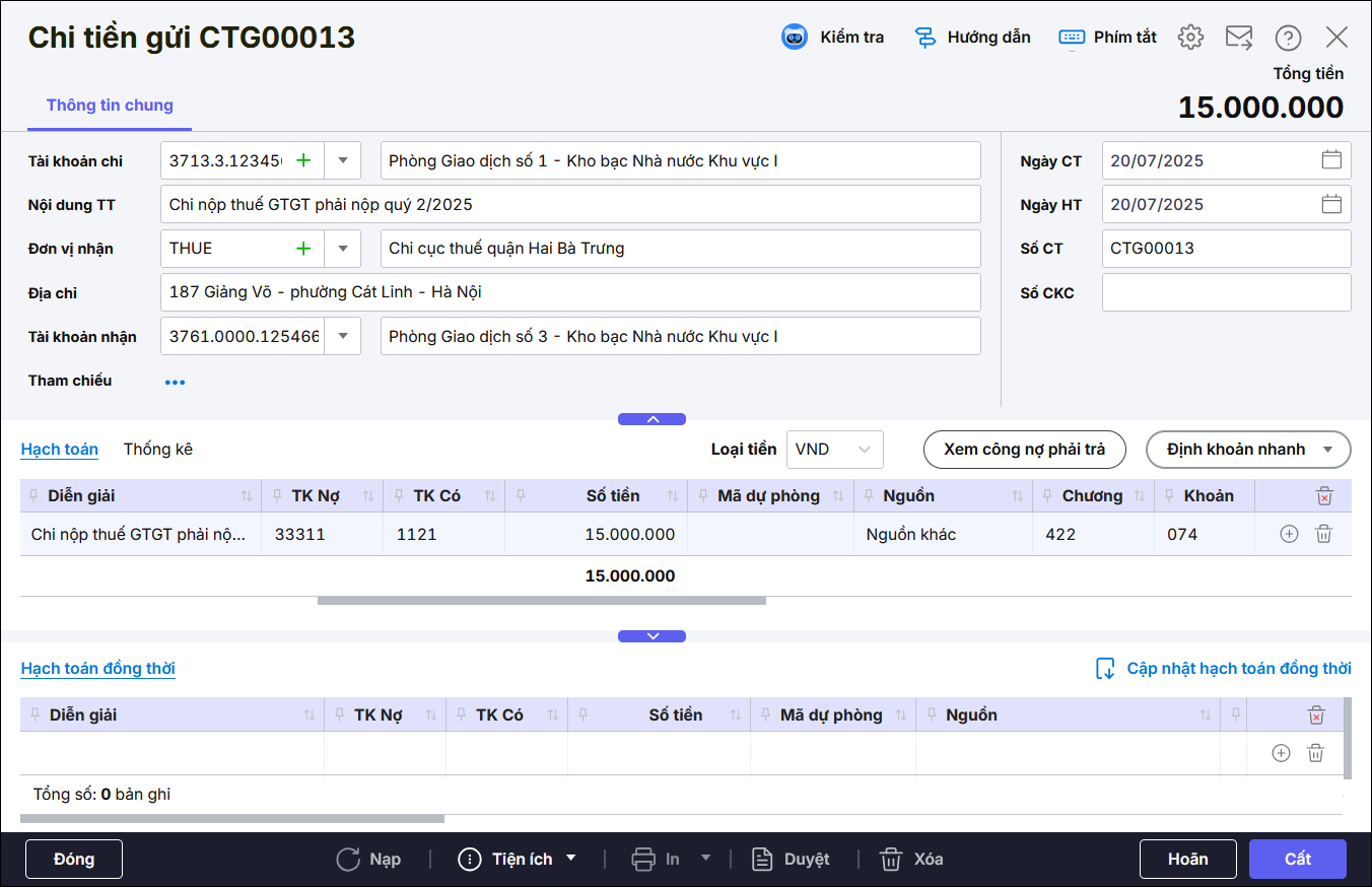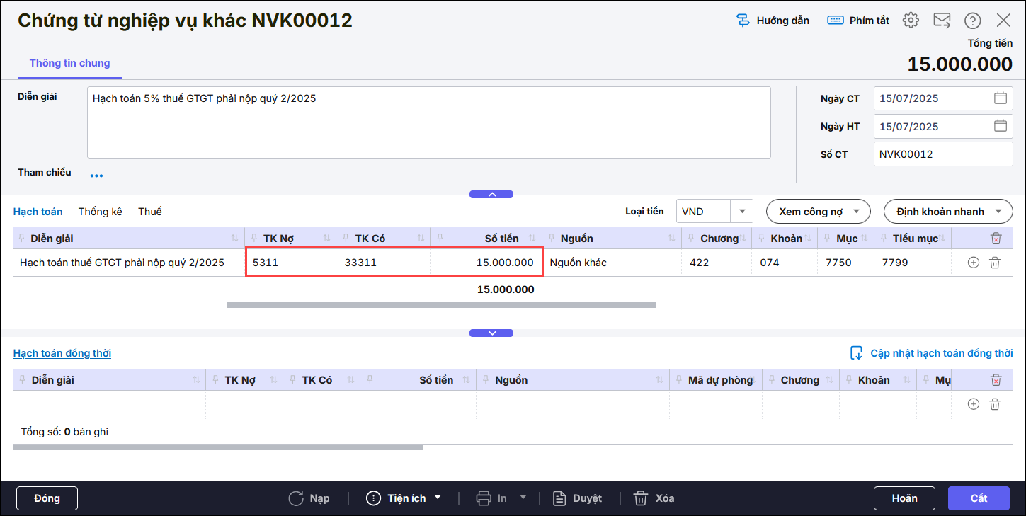 • Hạch toán: Nợ TK 5311/ TK 33311, Nguồn là Nguồn khácCấp phát Khác và Nghiệp vụ là Không chọn.