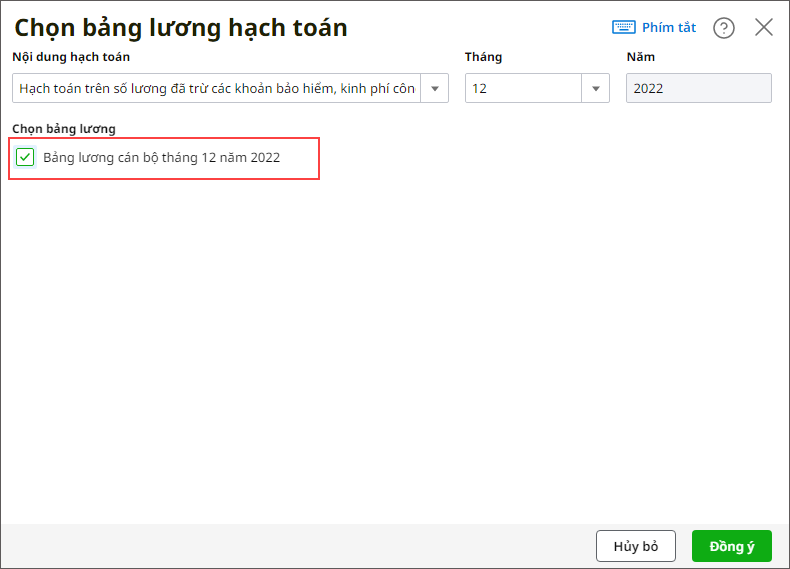 - Đơn vị chọn bảng lương cần hạch toán và nhấn Đồng ý phần mềm sẽ tự động sinh chứng từ hạch toán chi phí lương, đơn vị nhấn Cất.