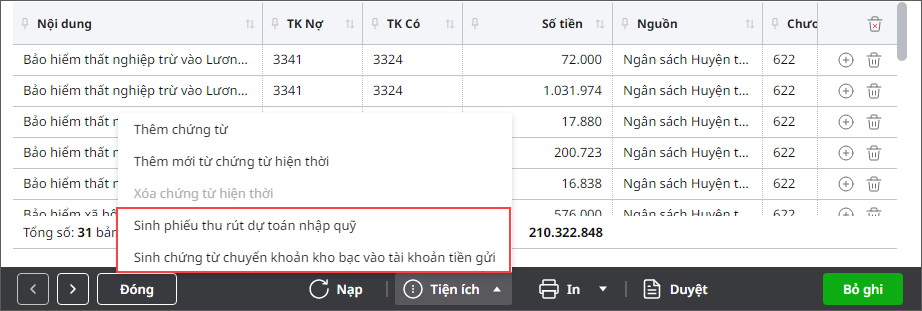 - Trên chứng từ hạch toán chi phí lương vào Tiện ích\Sinh chứng từ chuyển khoản kho bạc vào TK tiền gửi.