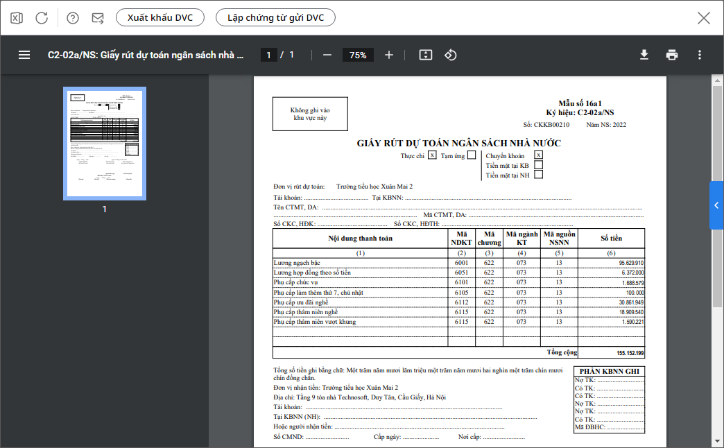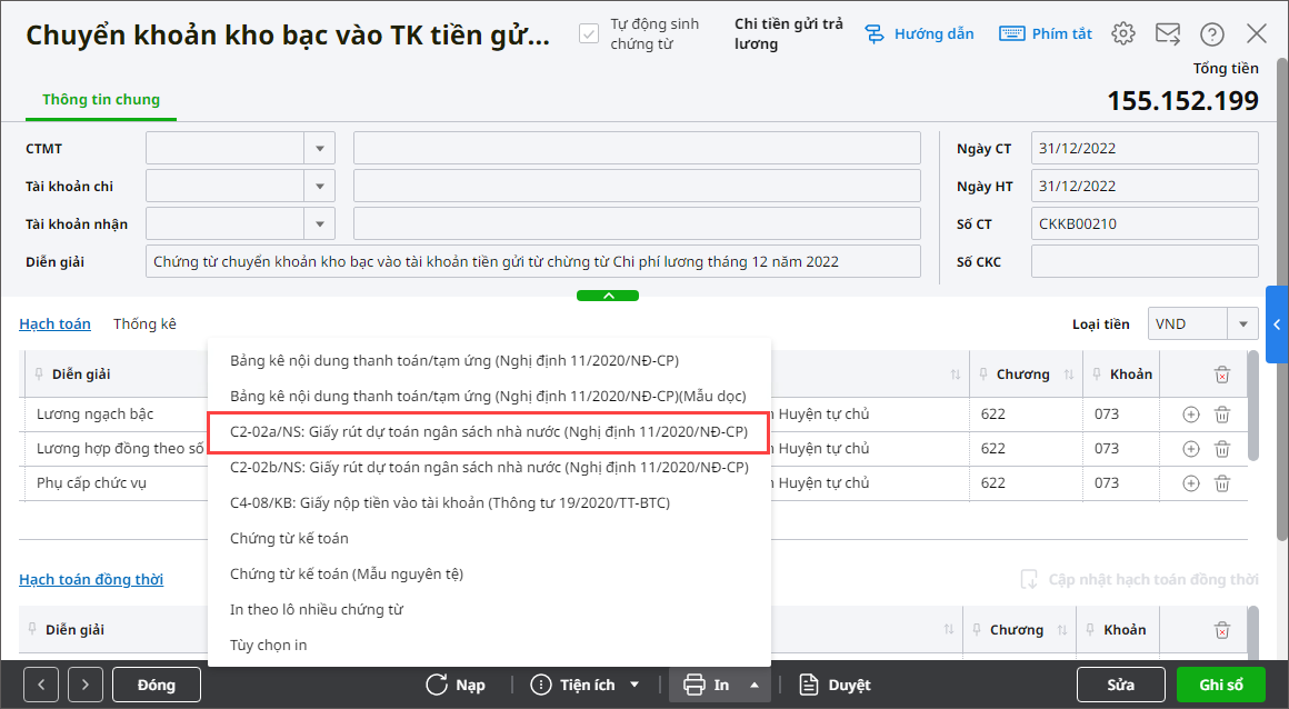 - Sau khi cất xong chứng từ, đơn vị vào In\C2-02a/NS: Giấy rút dự toán ngân sách nhà nước (Nghị định 11/2022-NĐ-CP) để in.