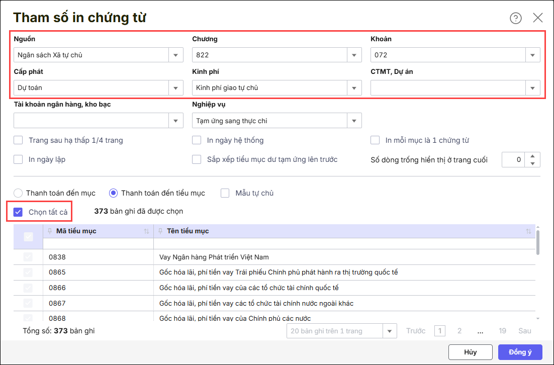 Lưu ý: Cần chọn đúng Nguồn, chương, khoản, Kinh phí theo chứng từ phát sinh trên bảng kê nếu không mẫu C2-03/NS: Giấy đề nghị thanh toán tạm ứng sẽ không lên số liệu (Không có số tiền, tiểu mục, chương, khoản).