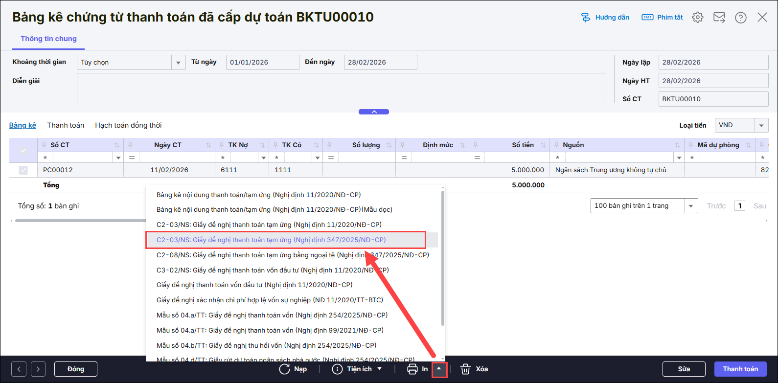 Bước 2: Khi bảng kê ở trạng thái chưa thanh toán, nhấn In\C2-03/NS: Giấy đề nghị thanh toán tạm ứng (Nghị định 347/2025/NĐ-CP).