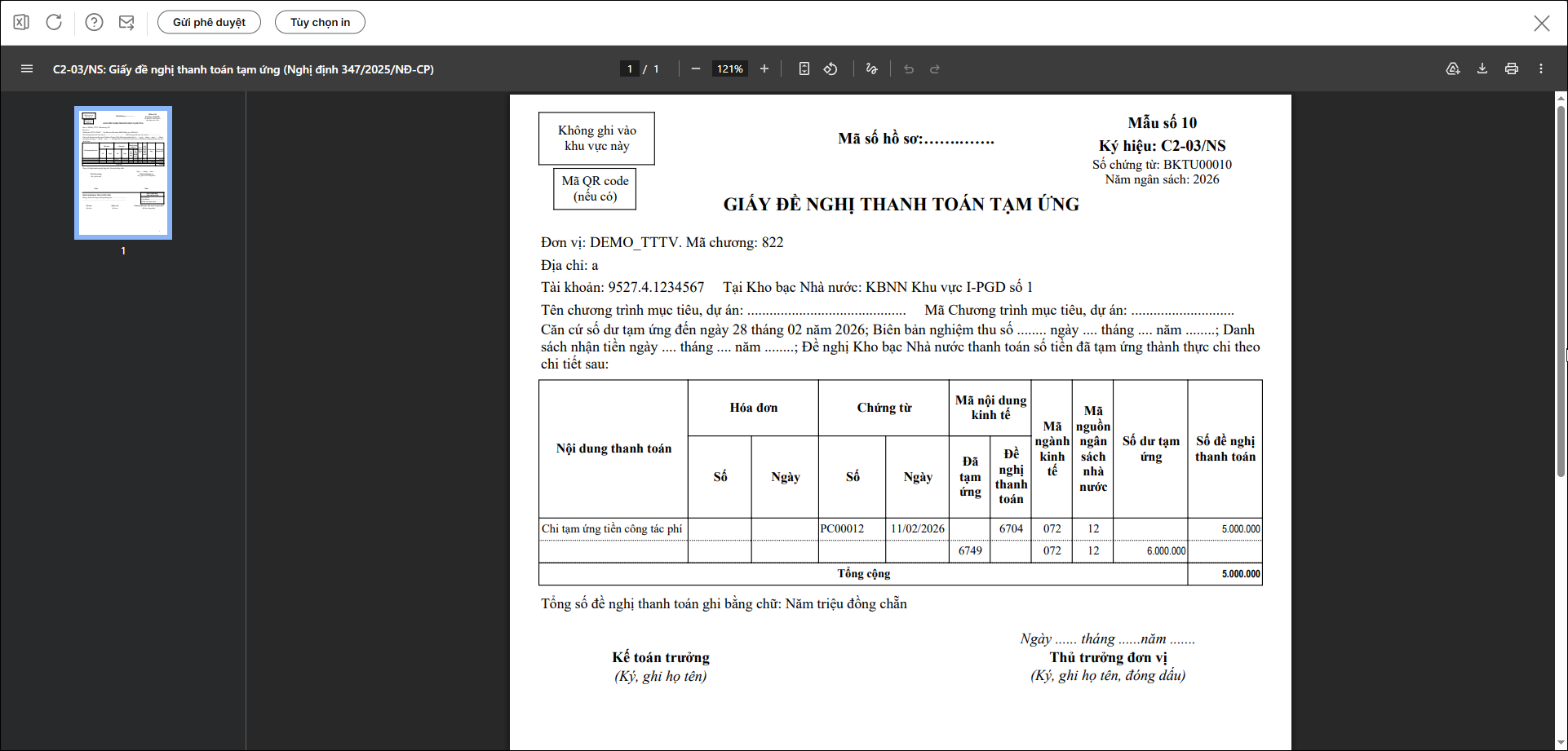 Bạn thực hiện các bước sau để in C2-03/NS: Giấy đề nghị thanh toán tạm ứng (Nghị định 347/2025/NĐ-CP).
