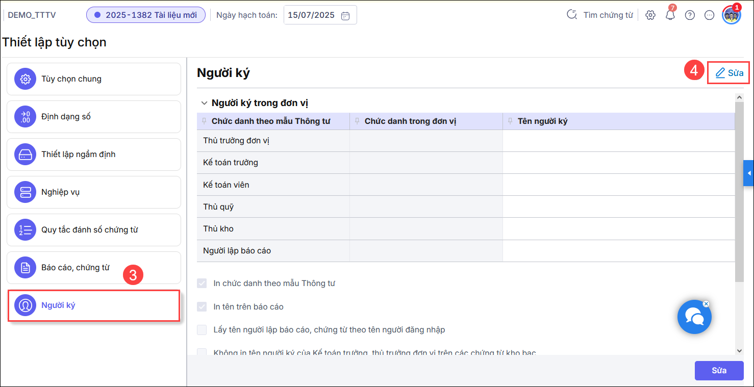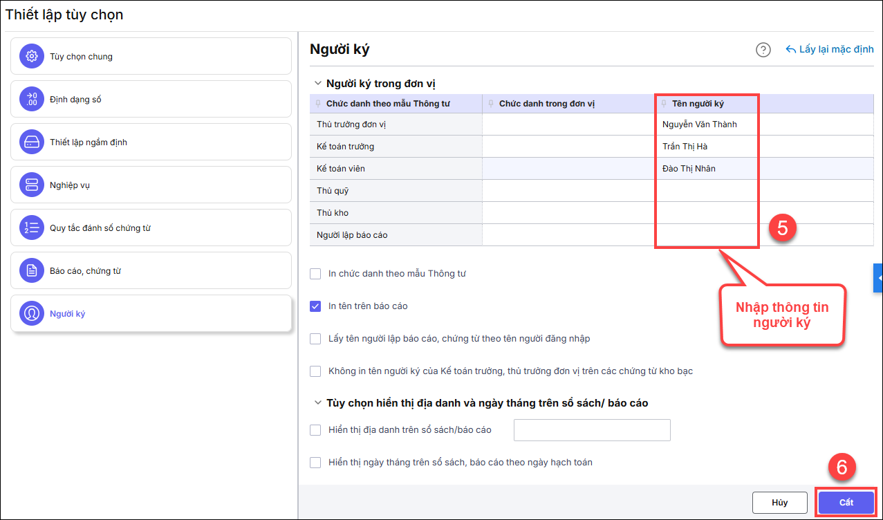 4. Tôi muốn thay đổi tên người ký trên chứng từ hoặc báo cáo thì làm thế nào?