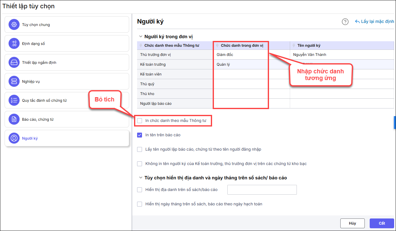 • Lưu ý: Nếu in báo cáo, chứng từ tên người lập không giống Tên người ký đã nhập ở mục này hoặc tên bị đảo ngược so với tên người ký đúng thì bạn bỏ tích Lấy tên người lập báo cáo, chứng từ theo tên người đăng nhập.