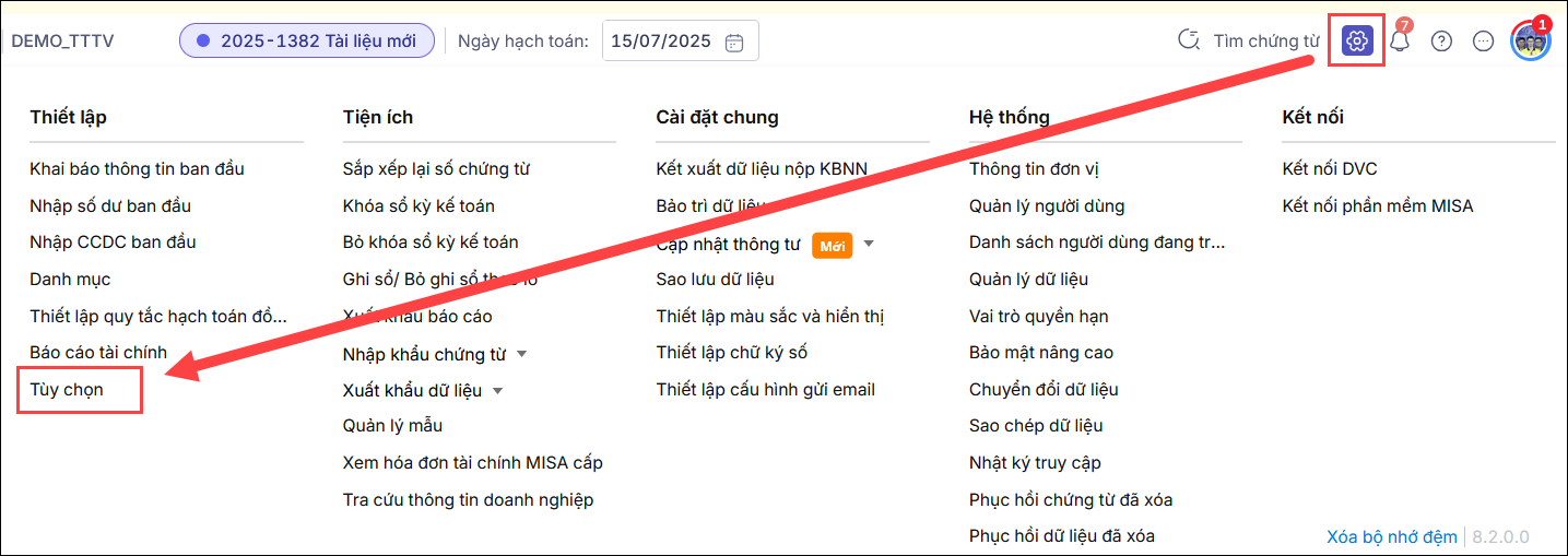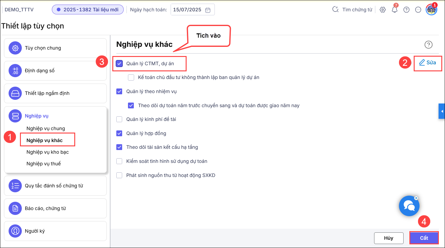 Làm thế nào khi nhập chứng từ nhưng không có cột CTMT, dự án? Mục lục Biểu hiệnGiải pháp Biểu hiện Trên giao diện nhập liệu chứng từ không tìm thấy cột CTMT, dự án Giải pháp 1. Bạn vào Bánh răng ⚙\Thiết lập\Tùy chọn 2. Vào Nghiệp vụ khác tích Sửa 3. Tích chọn Quản lý CTMT, DA. Nhấn Cất Lượt xem: 266 Cập nhật 15/07/2025 Bài viết này hữu ích chứ? Có Không Bài viết liên quan Các mẫu chứng từ Nghị định 347/2025/NĐ-CP đáp ứng trên phần mềm MISA Mimosa Làm thế nào để tra cứu MST cá nhân? Làm thế nào khi nhập khẩu chứng từ báo Cột ngày tháng không đúng định dạng? Hướng dẫn ký chữ ký số trên File PDF Làm thế nào khi cất chứng từ báo “Ngày hạch toán không hợp lệ” Cách đặt câu hỏi hiệu quả khi Chat với nhân viên tư vấn MISA Giải đáp miễn phí qua facebookNếu bạn vẫn còn thắc mắc hãy đăng câu hỏi vào cộng đồng MISA qua facebook để được giải đáp miễn phí và nhanh chóngĐĂNG BÀI NGAY