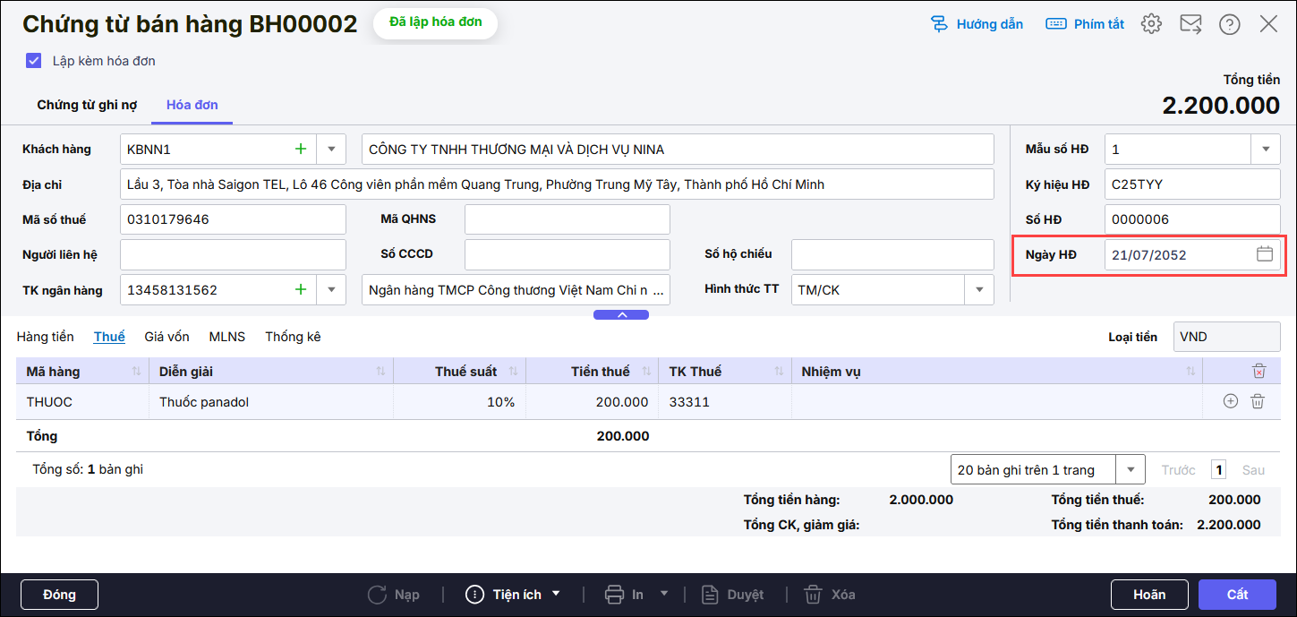 - Nguyên nhân 2: Điền nhầm ngày hóa đơn ( đánh nhầm tháng hoặc năm). Khi lập bảng kê tháng 7/2025 nhưng hóa đơn điền nhầm là năm 2052.