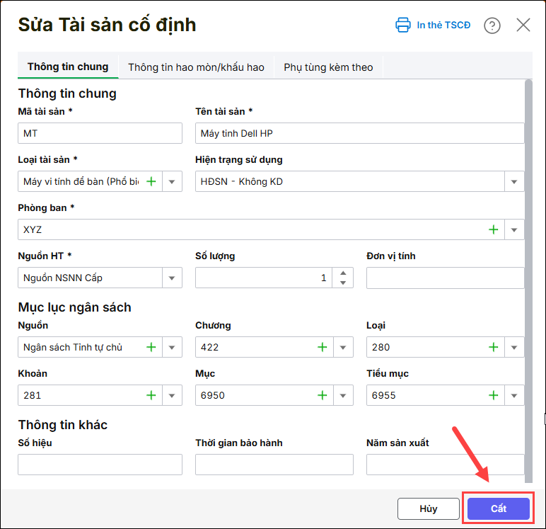 - Mở TSCĐ lên. Nhấn Cất