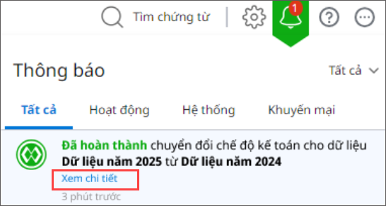 Bước 1: Sau khi hệ thống chuyển chế độ kế toán thành công thì sẽ thông báo ở mục quả chuông. Nhấn Xem chi tiết để xem danh sách số dư của các tài khoản cũ được chuyển sang tài khoản mới.