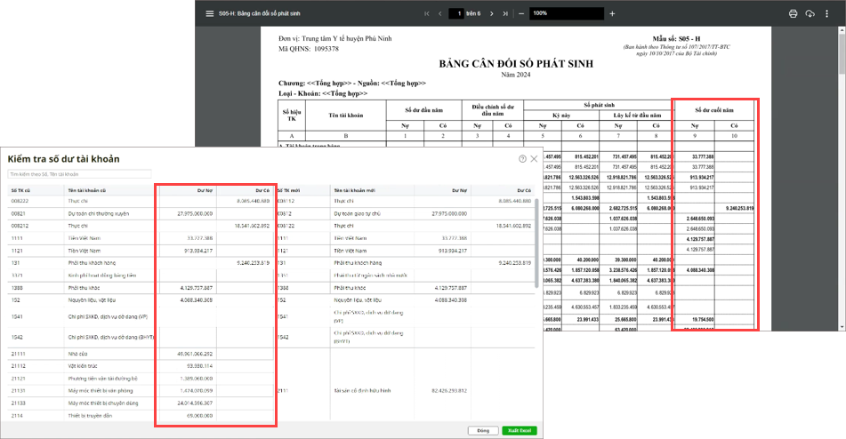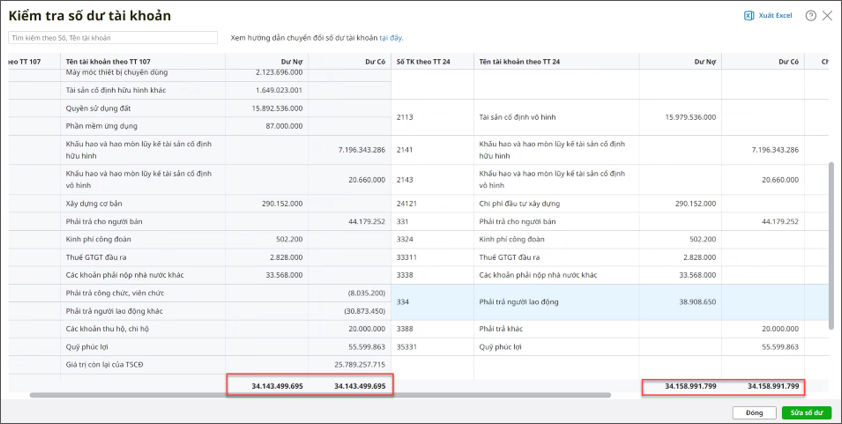 - Trên màn hình Kiểm tra số dư tài khoản, tiếp tục đối chiếu tổng số dư tài khoản theo TT107 với tổng số dư tài khoản theo TT24.