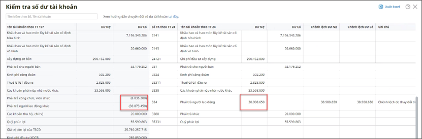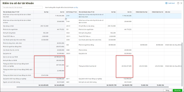 Bước 2: Thực hiện đối chiếu số dư tài khoản trên dữ liệu theo TT107 và dữ liệu sau khi cập nhật TT24 bằng cách: