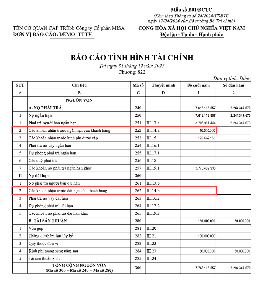 Bước 3: Kiểm tra số dư Có TK 131 sẽ bằng với tổng chỉ tiêu 252 (Các khoản nhận trước ngắn hạn của khách hàng) và chỉ tiêu 262 (Các khoản nhận trước dài hạn của khách hàng) trên B01/BCTC: Báo cáo tình hình tài chính.