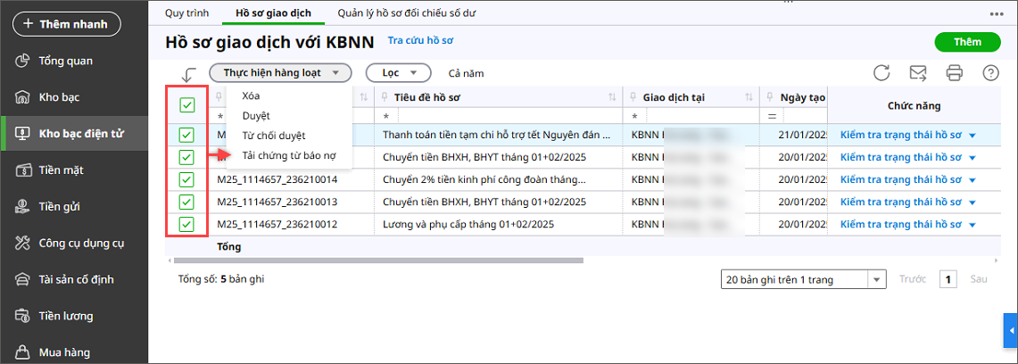 Bước 2: Tích chọn các các hồ sơ giao dịch đã được KBNN phê duyệt.