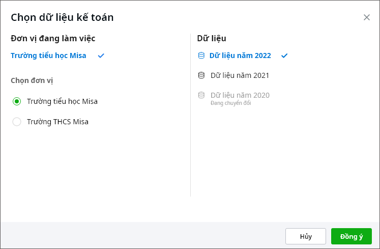 Bước 3: Chọn đơn vị và dữ liệu kế toán cần làm việc.