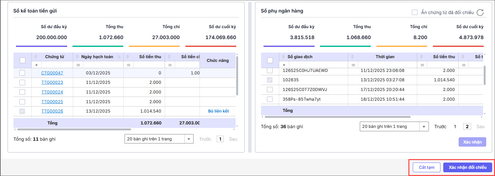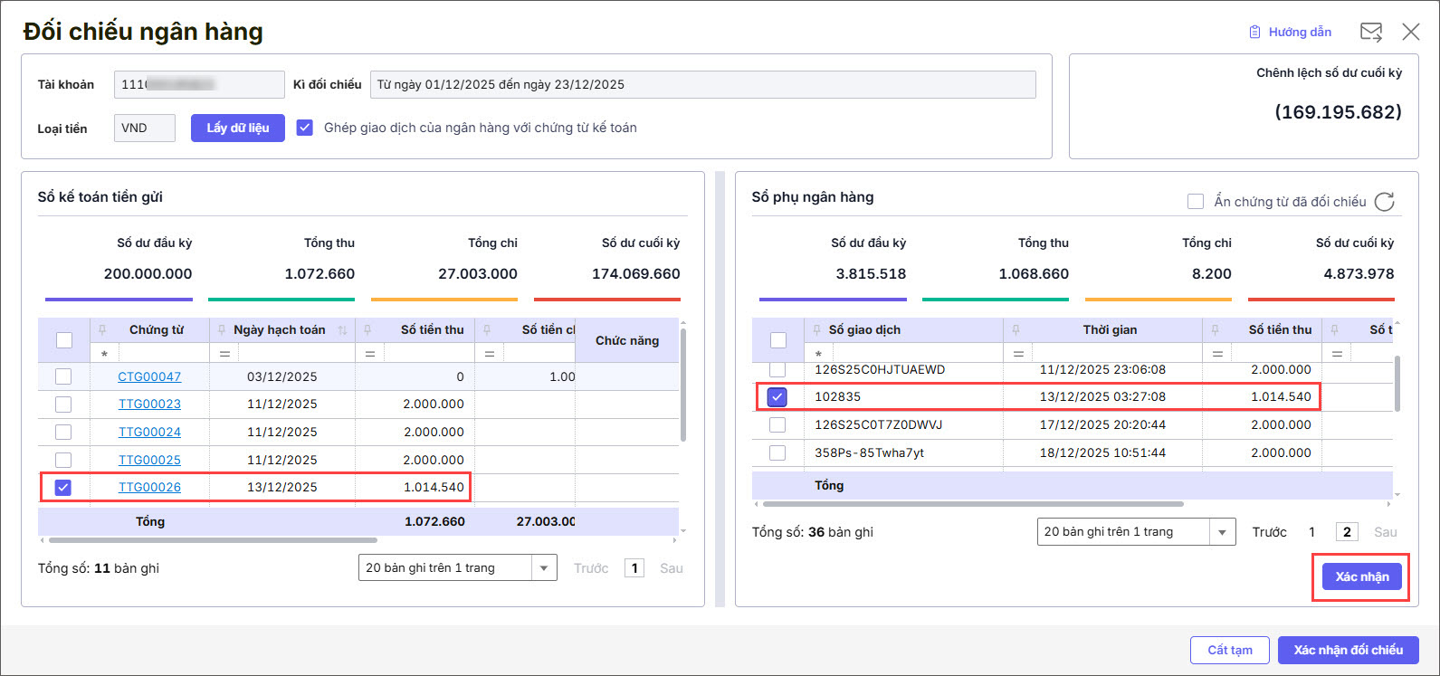 Bước 6: Sau khi đã chọn các cặp chứng từ/giao dịch khớp nhau, nhấn Xác nhận để xác nhận liên kết giữa các chứng từ/giao dịch này.