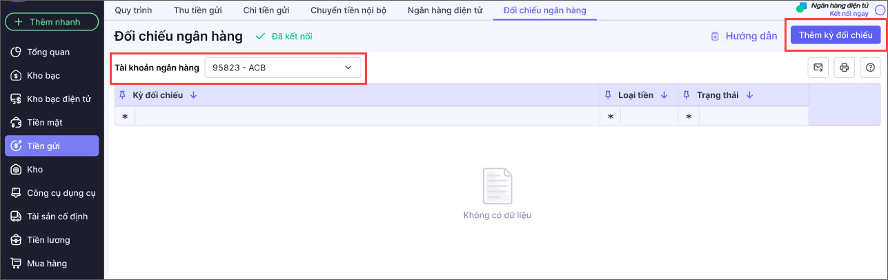 Bước 2: Thực hiện kết nối với ngân hàng điện tử mở số tài khoản muốn đối chiếu (xem hướng dẫn kết nối ngân hàng tại đây).