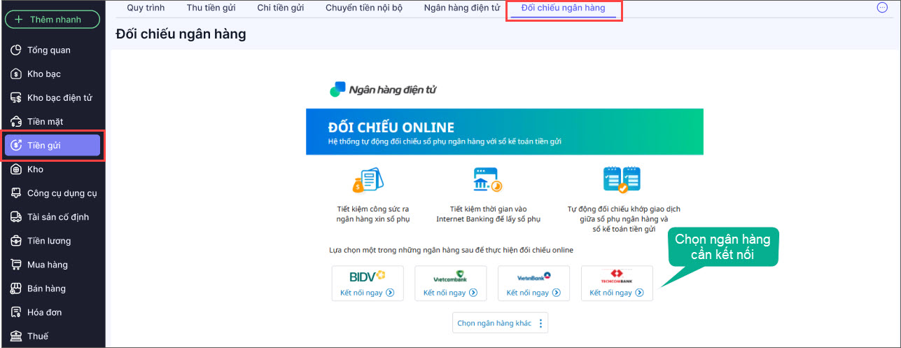 Bước 1: Vào phân hệ Tiền gửi, mục Đối chiếu ngân hàng.