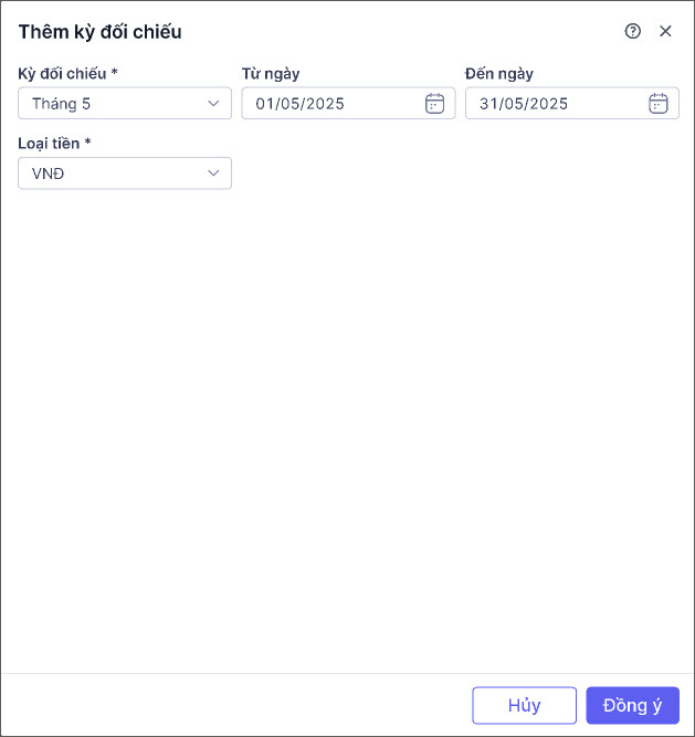 • Chọn Kỳ đối chiếu, Loại tiền.