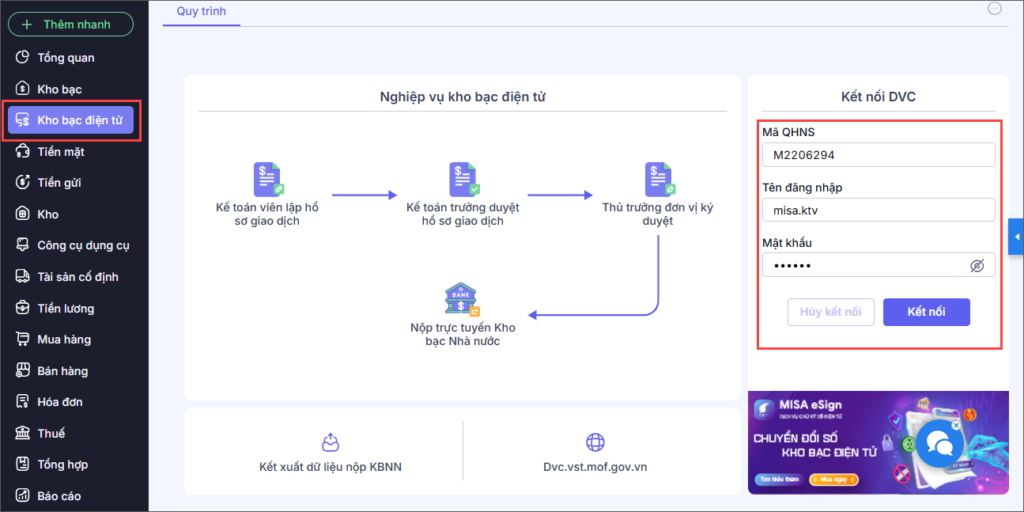 Cách 2: Thực hiện kết nối DVC trên phần mềm MISA (Tài khoản kết nối là tài khoản dùng để đăng nhập vào trang DVC dvc.vst.mof.gov.vn)