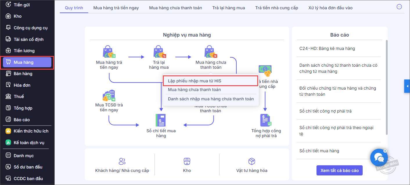 2. Chọn Mua hàng chưa thanh toán\Lập phiếu nhập mua từ HIS.