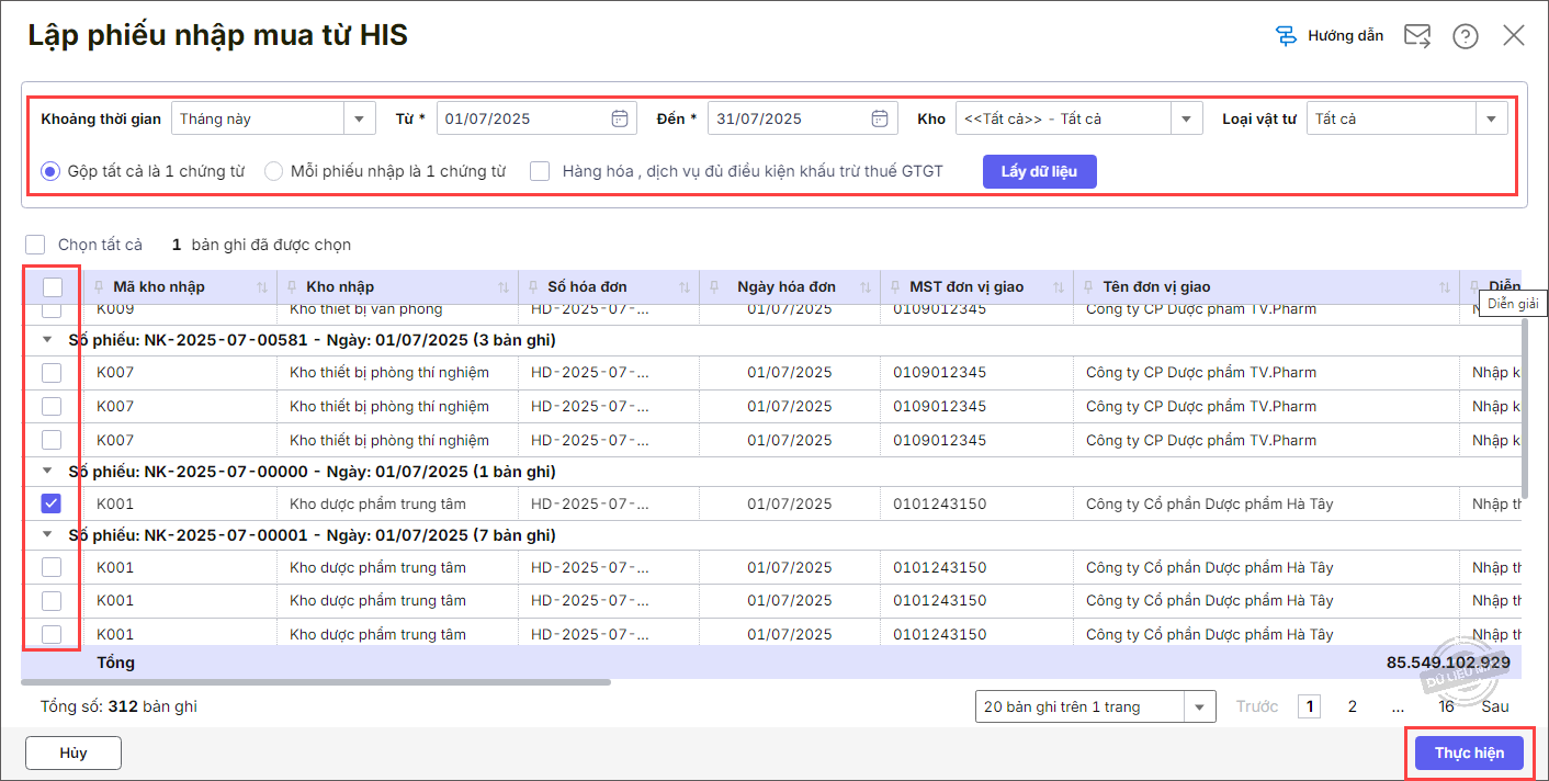 5. Tích chọn các phiếu nhập cần lấy về. Nhấn Thực hiện.