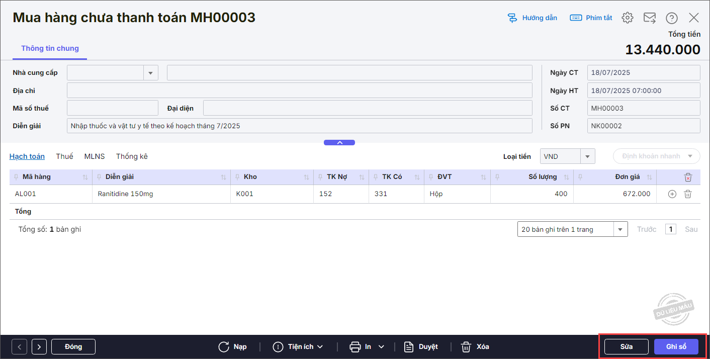 7. Nhấn Sửa để bổ sung thêm thông tin cho chứng từ hoặc nhấn Ghi sổ để ghi sổ chứng từ.