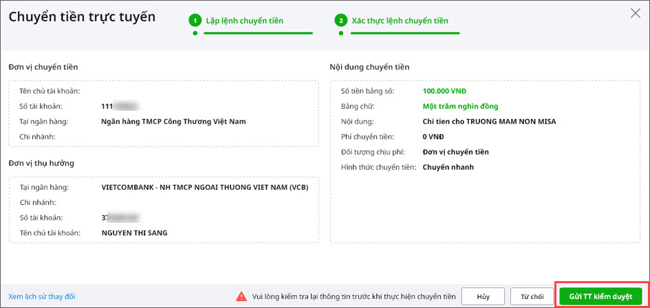 Bước 3: Thủ trưởng đơn vị phê duyệt giao dịch chuyển tiền Khi Kế toán trưởng đã phê duyệt lệnh chuyển tiền trên phần mềm, lệnh này sẽ tự động được chuyển lên hệ thống ngân hàng để tiếp tục xử lý. Thủ trưởng đơn vị đăng nhập vào hệ thống ngân hàng để xem xét và hoàn tất duyệt giao dịch chuyển tiền. Ví dụ: