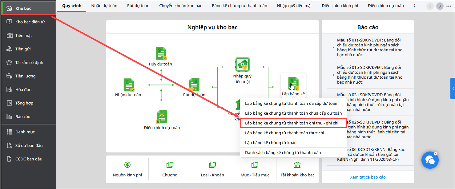 - Vào nghiệp vụ Kho bạc, chọn Lập bảng kê\Lập bảng kê chứng từ thanh toán ghi thu ghi chi.