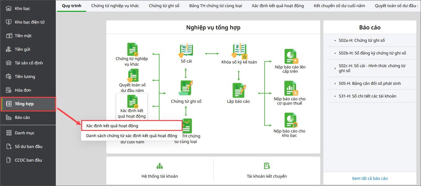 - Vào nghiệp vụ Tổng hợp\Xác định kết quả hoạt động.