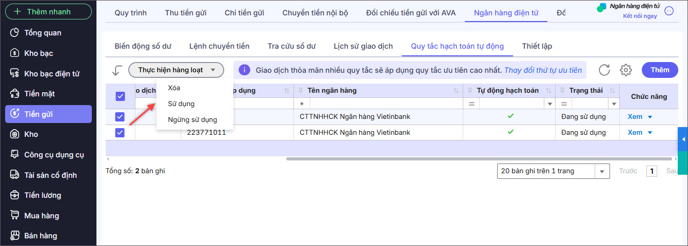– Để Xóa hoặc bật/tắt sử dụng nhiều quy tắc hạch toán cùng lúc, bạn tích chọn các quy tắc muốn thao tác, sau đó nhấn Thực hiện hàng loạt và chọn chức năng cần thực hiện trong danh sách.