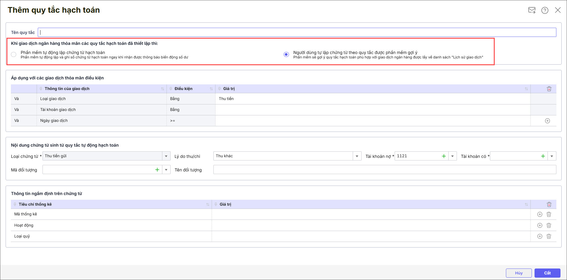 - Nếu tích chọn Phần mềm tự động lập chứng từ hạch toán: Các giao dịch thỏa mãn quy tắc sẽ tự động sinh chứng từ và không ghi sổ.