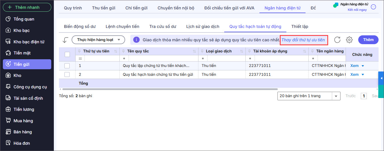 - Tại danh sách quy tắc hạch toán tự động, nhấn Thay đổi thứ tự ưu tiên.