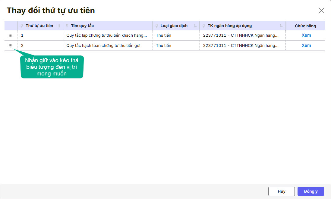 – Trường hợp 1 giao dịch thỏa mãn đồng thời nhiều quy tắc hạch toán, phần mềm sẽ áp dụng quy tắc có thứ tự ưu tiên cao nhất. Để thay đổi thứ tự ưu tiên, bạn làm như sau: