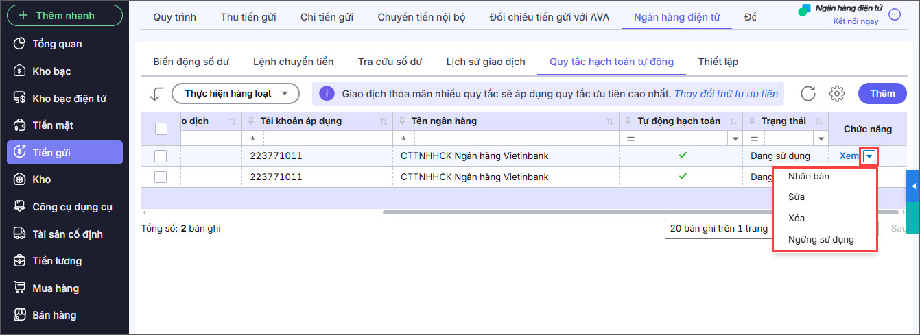Phạm vi áp dụng: Đơn vị có kết nối với Ngân hàng điện tử trên phần mềm và kế toán được phân quyền chức năng Thiết lập quy tắc hạch toán tự động (xem hướng dẫn kết nối tại đây).