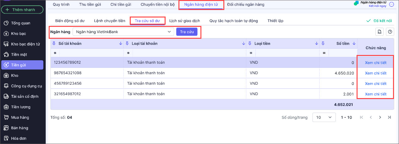 - Kết nối với ngân hàng điện tử mở số tài khoản muốn tra cứu (Xem hướng dẫn kết nối tại đây).