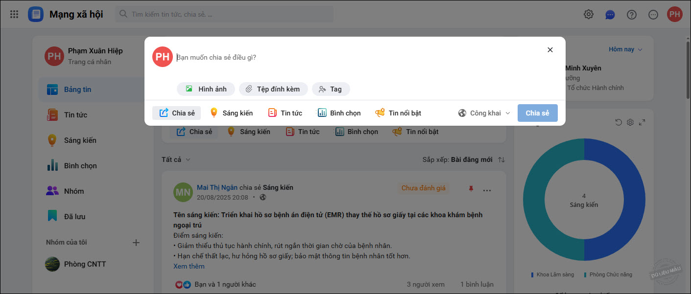 Bài viết hướng dẫn tạo và đăng bài chia sẻ trên trang iHOS Mạng xã hội để chia sẻ ý kiến hoặc thông tin hữu ích đến cán bộ nhân viên trong đơn vị.