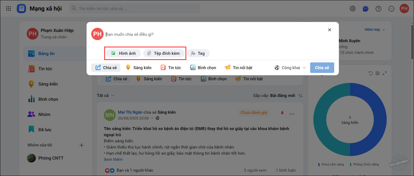2. Nếu nội dung chia sẻ có kèm hình ảnh hoặc tài liệu liên quan thì chọn Hình ảnh hoặc Tệp đính kèm để tải file từ máy tính.