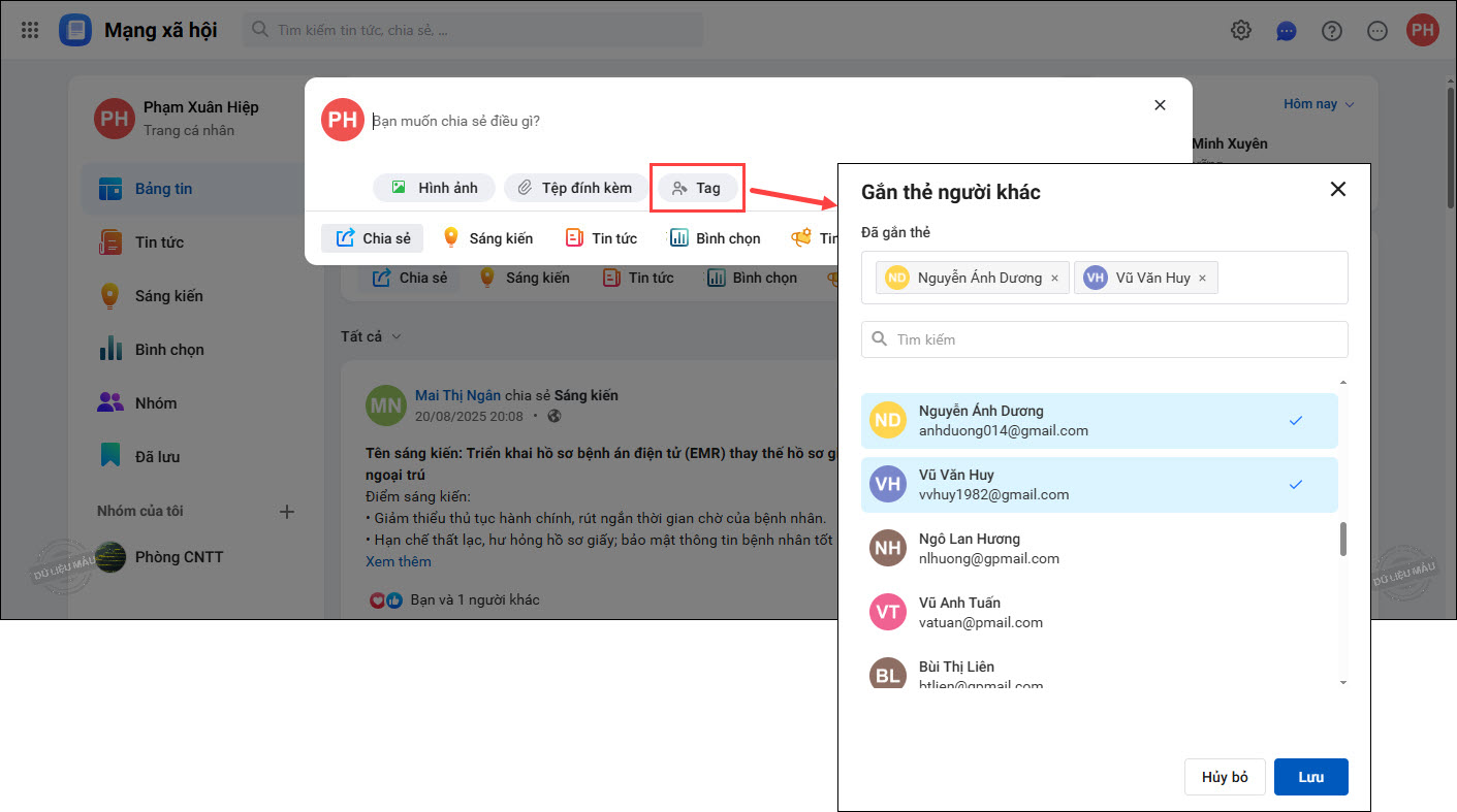 3. Nếu muốn gắn thẻ người khác thì chọn Tag, nhập tên hoặc email người dùng để tìm kiếm nhanh người cần tag và chọn người đó. Có thể gắn thẻ nhiều người cùng lúc.
