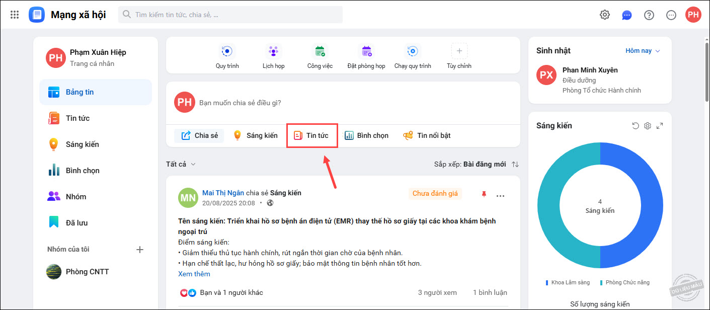 4. Nhấn Đăng, bài viết sẽ hiển thị trên bảng tin và phân hệ Tin tức.
