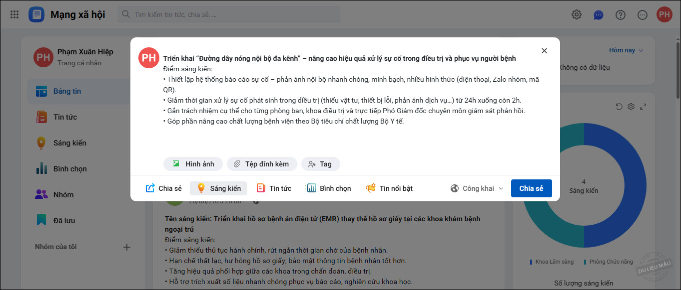5. Có thể vào phân hệ Sáng kiến để xem tất cả các bài đăng sáng kiến đã được chia sẻ trong đơn vị.