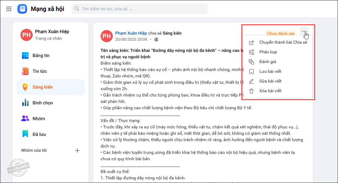 4. Sau khi đăng sáng kiến, có thể nhấn vào biểu tượng ⋯ để thực hiện các chức năng:
