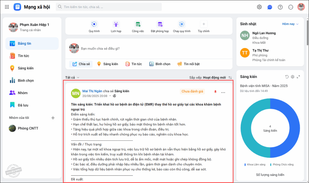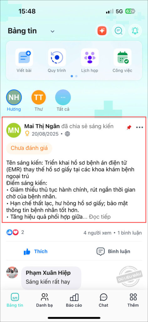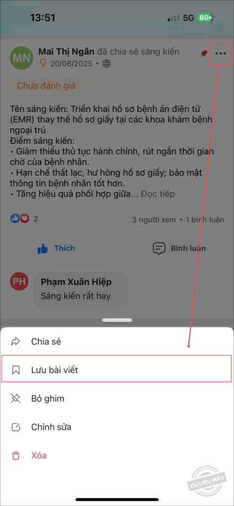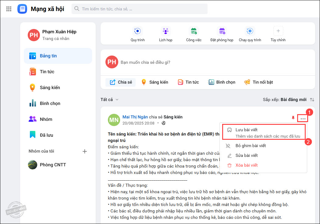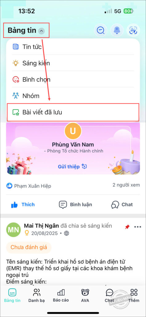 - Khi xem Bảng tin, anh/chị có thể lưu trữ bài viết yêu thích hoặc cần xem lại sau bằng cách nhấn vào biểu tượng 3 chấm, chọn Lưu bài viết.